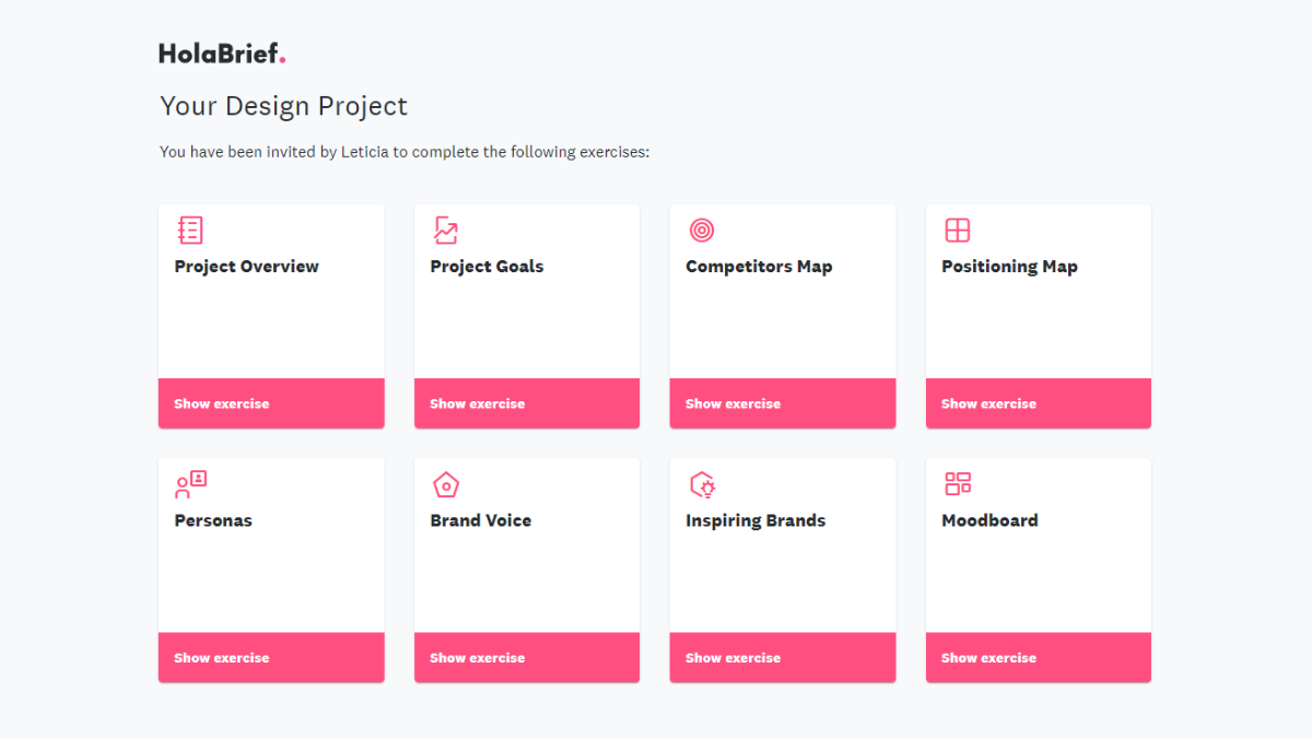 Either pick from our tested templates or create custom briefs using interactive exercises like Moodboard, Customer Persona, or Competitors Map. Once done, send the link to the client so they can respond without the need to have an account.